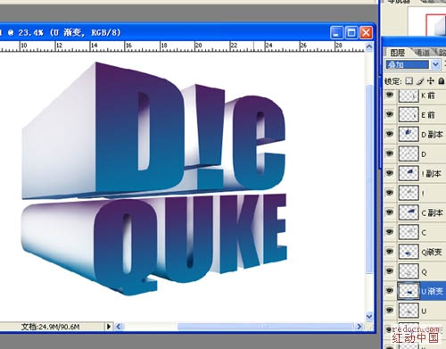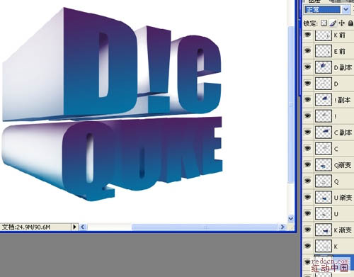 8、在前字母图层上使用渐变。后方透视图层进行复制,在复制层上使用相同渐变。
