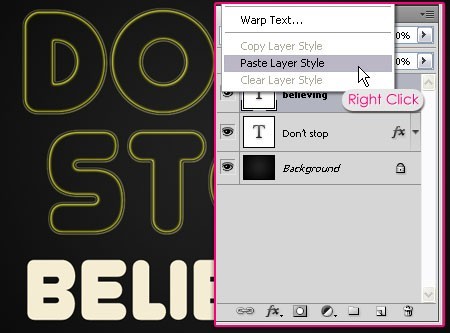 8、右击其他文本图层,选择粘贴图层样式。这将对新的文本图层应用同样的图层样式及同样的值。