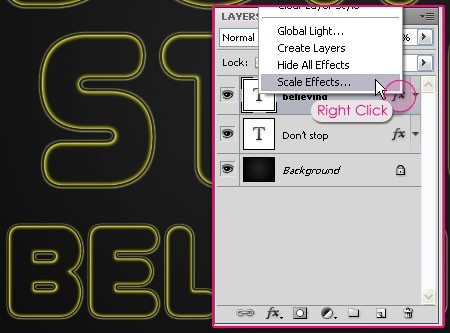 9、为了缩放风格,右击图层效果图标,选择缩放效果。