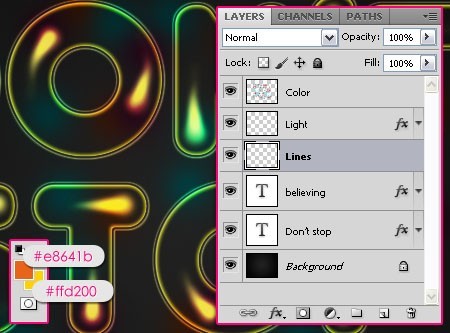 25、回到原始文件,在文本图层(s)的上方,“Color”和“Ligh”图层的下方创建一个新层,并命名为“Lines”。设置前景色为#