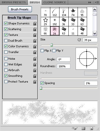 >画笔),并选择Dry 笔刷(尺寸39)。按下图改变设置: