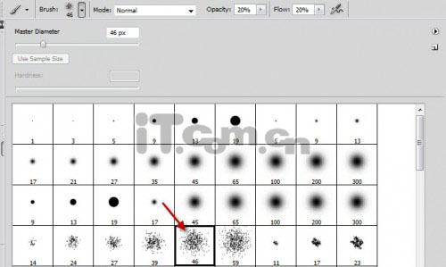 7、选择画笔工具,在属性中选择“滴溅”笔刷并设置不透明度和流量为20%,如图所示。
