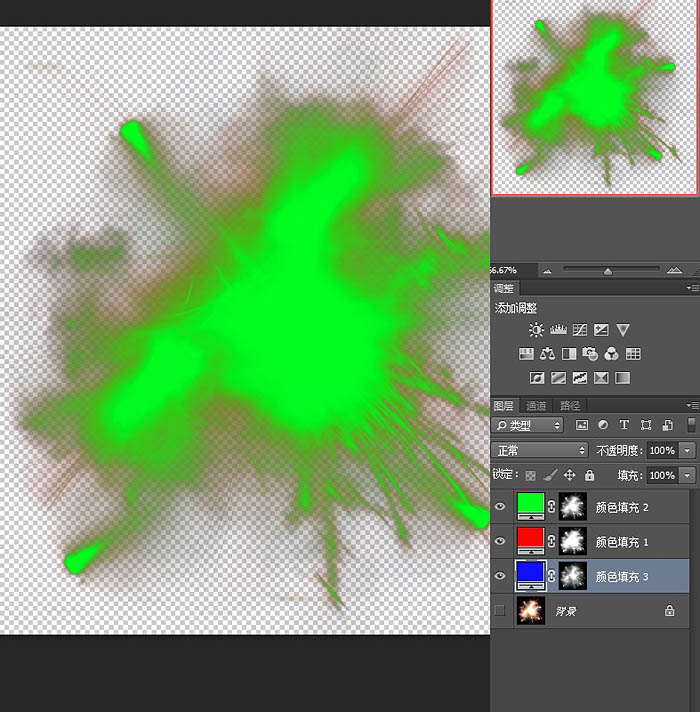 4、使用纯红色填充,填充完毕后将新建的红色纯色层隐藏,并将绿色和蓝色通道按照此方法建立相应的纯色层。