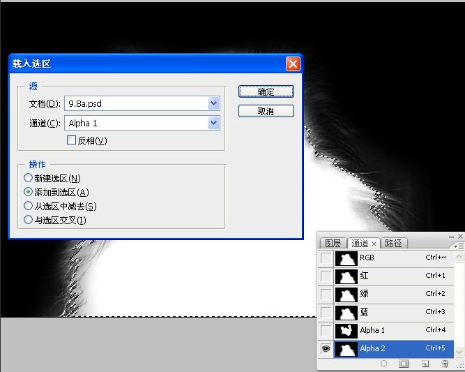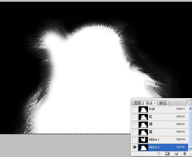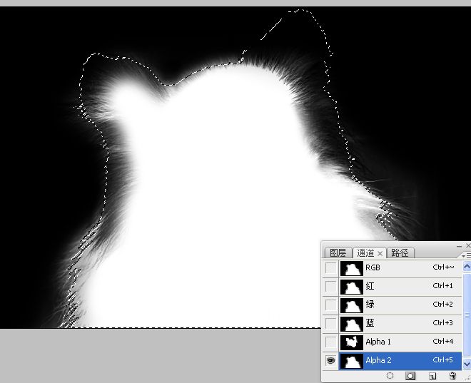 19、现在狗狗棕色毛发和白色毛发的选区分别存储在“ALPHA1”和“ALPHA2”通道中,我们需要把它们合并为一个完整的选区。单击将通道作为选区载入按钮,载入ALPHA2通道的选区。