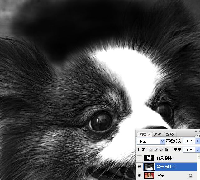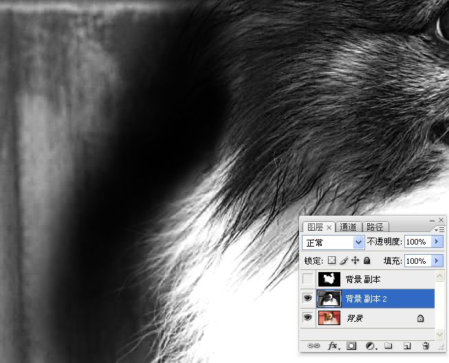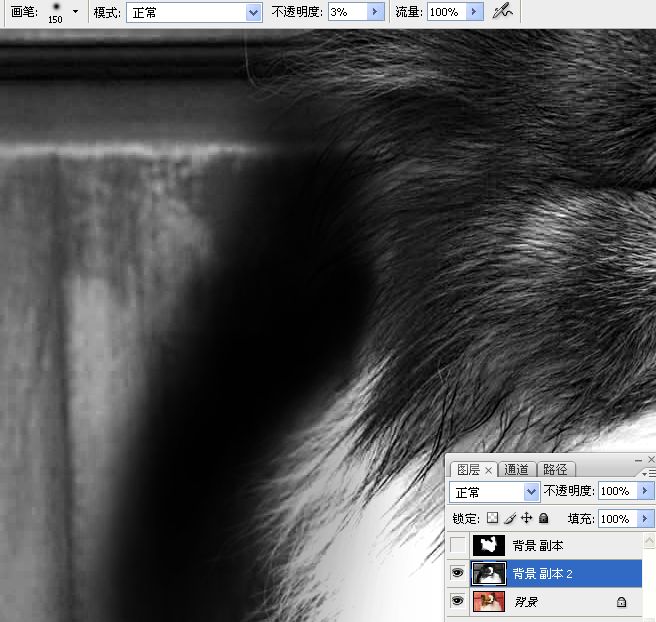 16、用黑色画笔涂抹脖子处的背景。设置画笔工具的混合模式为“正常”,不透明度为3%,用黑色在身体靠近毛发边缘处涂抹,将这里罩上一层淡淡的灰色。