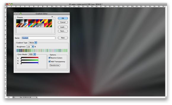 7、添加另一个层,然后选择渐变工具(G)。点击渐变颜色打开渐变编辑器,然后更改类型为杂色,100%的粗糙度,选择这两个选项:限制颜色和增加透明度。