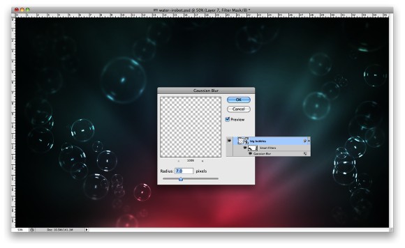 10、选择泡沫层,去滤镜>转换为智能滤镜,然后去滤镜>模糊>高斯模糊。使用7像素的半径。整个图层会很模糊,图层面板上白色的略缩图就是所谓的智能滤镜。选择画笔工具(B),使用黑色描绘你不希望泡沫模糊的地方。这就像是一个智能滤镜的蒙板。
