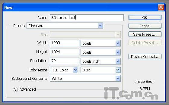 1、首先运行你的photoshop,创建一个新图片,在这里我选择了1280px*1024px尺寸的大小,如图所示。