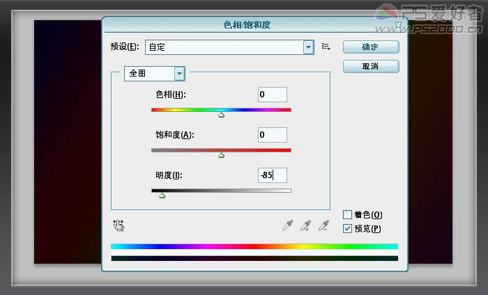 3、按ctrl+U调整色相/饱和度,适当降低明度如下图。