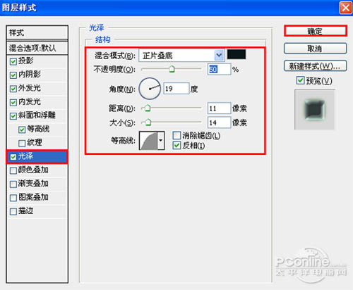 9、勾选光泽选项,设置混合模式:正片叠加,不透明度:50%,角度:19度,距离:11像素,大小:14像素,等高线:半圆,勾选反相,如图10所示。