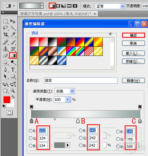 14、选择工具箱渐变工具(快捷键G),在工具选项栏中设置为线性渐变,然后点按可编辑渐变,弹出渐变编辑器。双击如图2-66中的A处,设置色彩RGB分别为122、134、134,再双击图2-66中所示的B处,设置色彩RGB分别为241、242、242,再双击图2-66中所示的C处,设置色彩RGB分别为149、166、165,单击确定按钮,按键盘快捷键