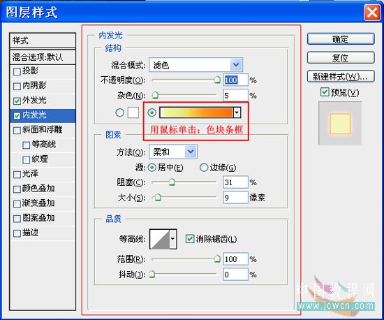 单击“图层”调板底部的“添加图层样式”按钮,在弹出的菜单中选择“内发光”命令,如图9所示: