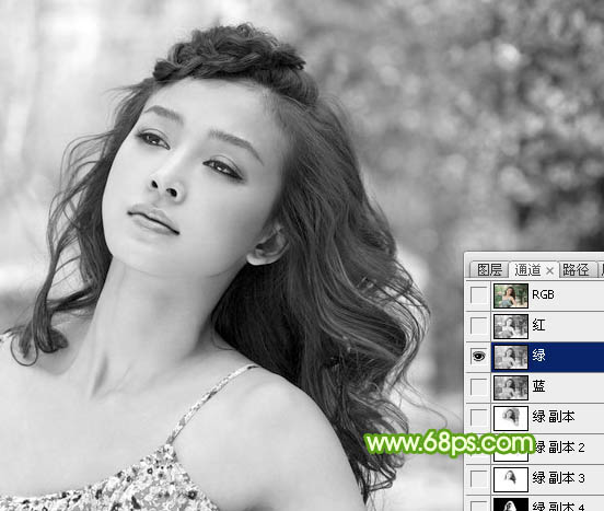 - 3,找出发丝与背景色差比较理想的通道,这里绿色通道比较好。