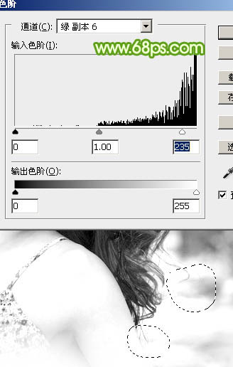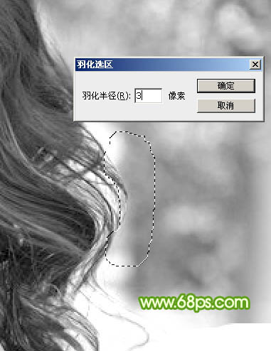 5、初步调亮后头发的明暗部分非常明显了。现在由右侧底部开始分段来处理。先用套索工具选区图8所示的选区,羽化10个像素后按Ctrl
