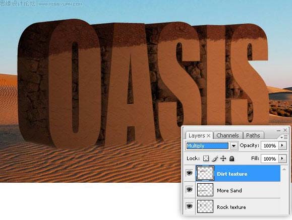 12、改变“泥土纹理”的混合模式为正片叠底,添加少量阴影效果。