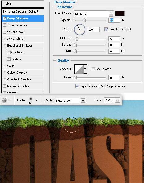 16、在“草地纹理”图层上添加少量的阴影。用海绵工具减少草地一些区域的饱和度。