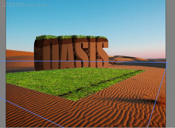 17、粘贴草地纹理到一个新图层上,在滤镜窗口中运用消失点(去滤镜>消失点),来匹配景观的可视性。