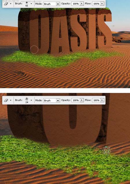 18、随机擦除“草地”图层的一些区域,这可以用一个不规则笔刷来实现。