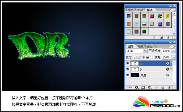 6、输入其它文字,调整好位置,按下刚刚保存的那个样式即可制作出同样效果的文字。至于文字颜色可以把文字与空白图层合并后,再用色彩平衡等调整即可。