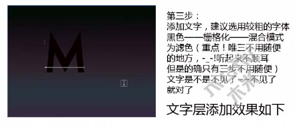 3、添加文字,建议选用较粗的字体,颜色为黑色,然后栅格化图层,把图层混合模式改为“滤色”,然后双击文字图层添加图层样式。