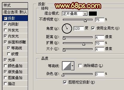 2、双击图层面板,文字缩略图,调出图层样式,参数设置如图下图。