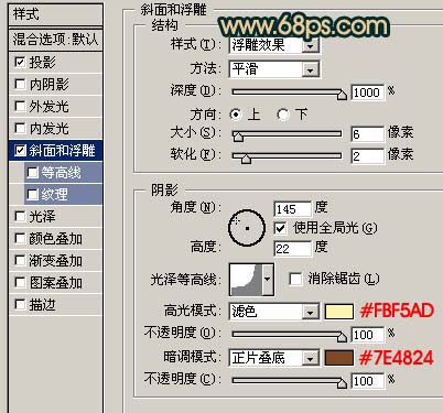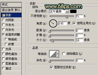 5、双击纹理图层缩略图调出图层样式,分别设置投影和斜面/浮雕,参数设置如图7,8,效果如图9。