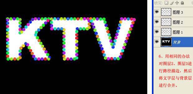 6、用相同的方法,对图层2和图层3进行路径描边,然后将文字图层与背景层合并。