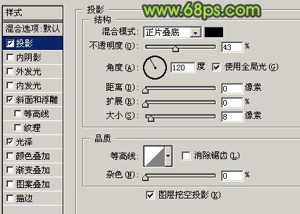 3.双击图层调处图层样式参数设置如图6-8,效果如图9