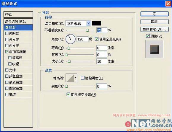 11、双击文字层,在弹出的图层样式对话框中选择“投影”“斜面和浮雕”样式,设置参数如图14、15所示,图像效果如图16所示。