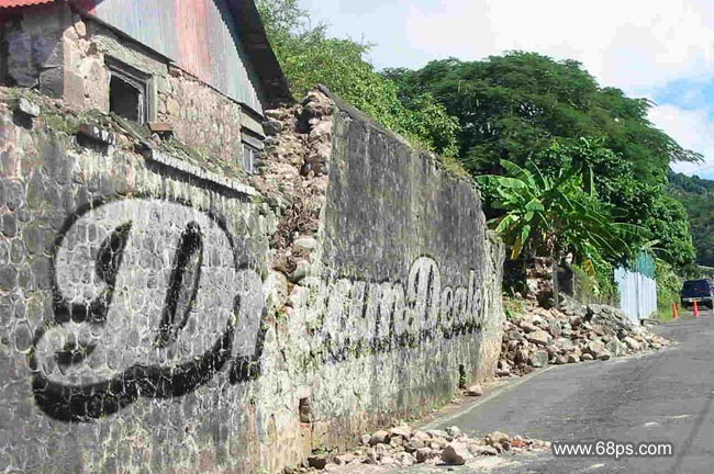 6.再适当的用橡皮工具把墙壁缺口上的文字擦除完成最终效果。