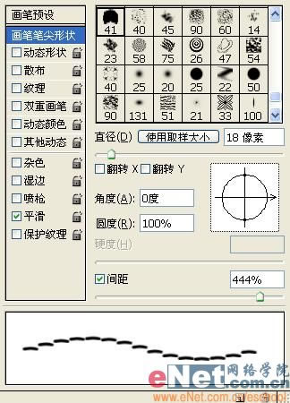 19、保持选区不变,单击画笔工具,选择刚才定义的画笔,设置如图27所示。设置好颜色,单击路径面板下方的“用画笔描边路径”按钮,效果如图28所示,然后将不正确的部分擦掉,并调整正确,如图29所示。