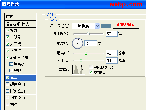 10、再添加图层样式“光泽”效果。参数如下图设置: