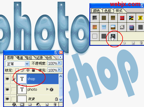 12、再输入shop,旋转,然后打开样式面板,选择“胶体字”,就上一步自定义的样式,如下图: