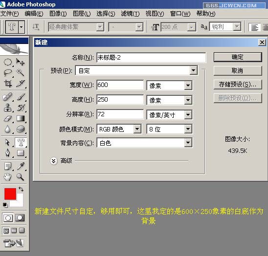 1、新建文件,尺寸自定,够用即可,这里我定的是600*250像素的白底作为背景。