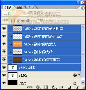 12.按住Shift键的同时单击图层调板中最上面的图层,然后再单击图层“YESKY副本”,选中如图11所示的这几个图层,然后按Ctrl+E键(对应的菜单命令为“图层>合并图层”)将它们合并为一个图层。