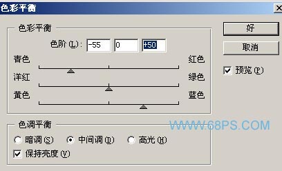 5.按Ctrl + E合并可见图层,然后 按Ctrl + B 选择色彩平衡 参数设置如图6,效果如图7