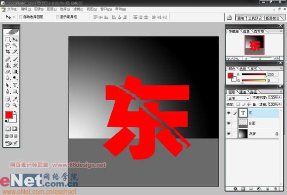 三、新建一个文字层,随意写一个字,我就用我的名字“东”吧!