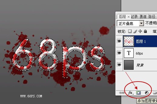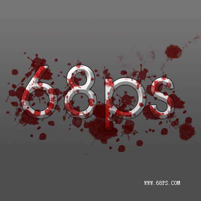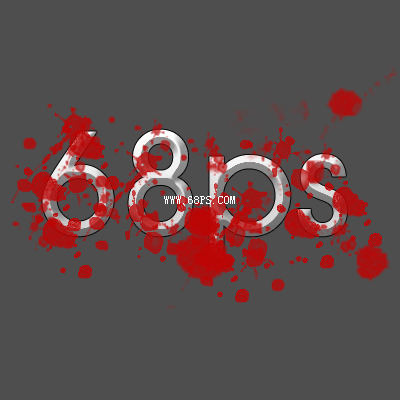 3、在文字图层上面新建一个图层,选择画笔工具,选取血迹笔刷。(如果你没有安装这个笔刷请直接点这里下载,进去后输入血迹查询就有了)喷出如图6所示的图形。然后把图层混合模式改为正片叠加效果如图7