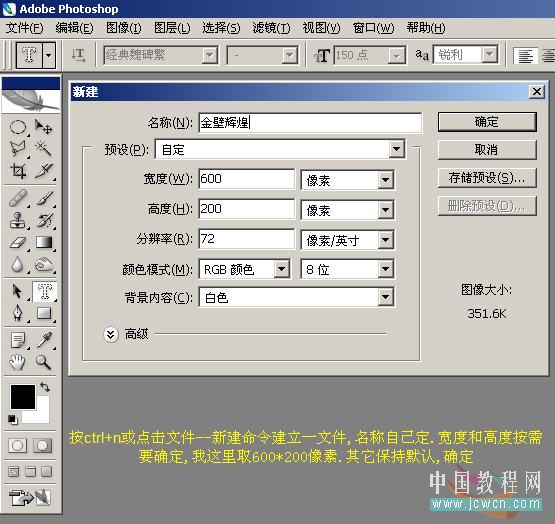 1、按Ctrl+n或者点击文件——新建命令建立一文件,名称自己字,宽度和高度按需要确定,我这里取600×200像素,其它保持默认,确定。