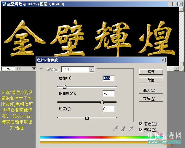 17、勾选“着色”项,设置饱和度大于70比较好,色相值可以观察着图像调整,一般40左右,满意后确定退出对话框。