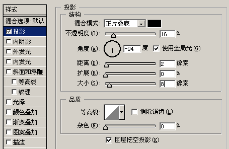 4.把刚才翻转的图形适当的变换角度如图9,然后调出图层样式进行投影参数设置如图10,效果如图11