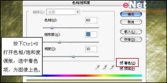 4、按下Ctrl+U打开色相/饱和度调版,选中着色项,为图像上色。