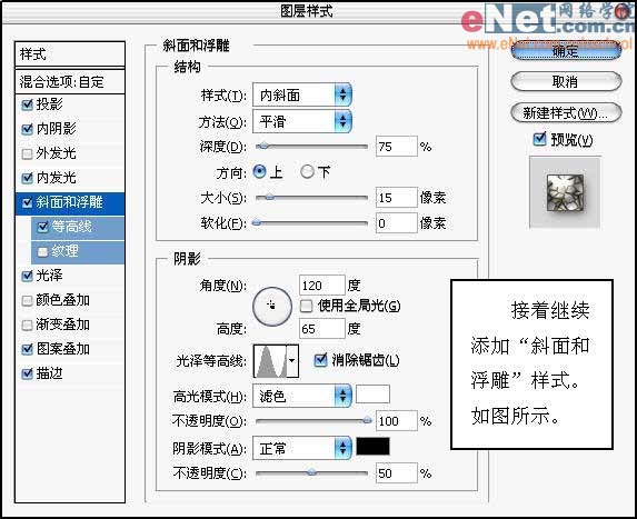 9、接着继续添加“斜面和浮雕”样式,如图所示。