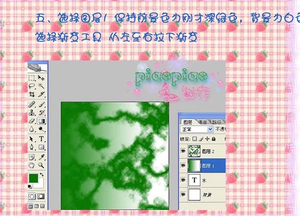 五、选择图层1,保持前景色为刚才深绿色,背景为白色,选择渐变工具,从左至右拉下渐变(如下图):