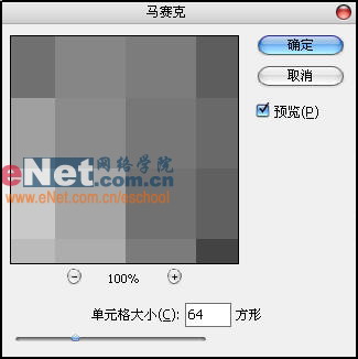 2、执行“滤镜”→“像素化”→“马赛克”命令,将单元格大小设置为64。