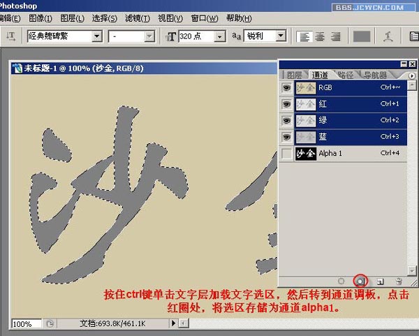 八、按住Ctrl键单击文字层加载文字选区,然后转到通道调板,点击红圈处,将选区存储为通道alpha1。