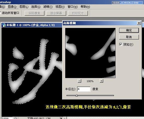 十一、连续做三次高斯模糊,半径依次递减为:4,2,1像素。