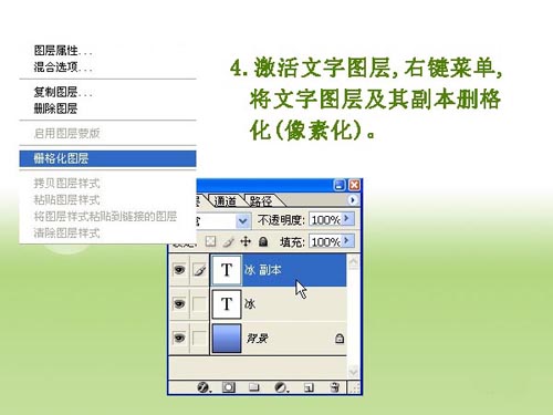 4、激活文字图层,将文字图层及其副本删格化(像素化)。
