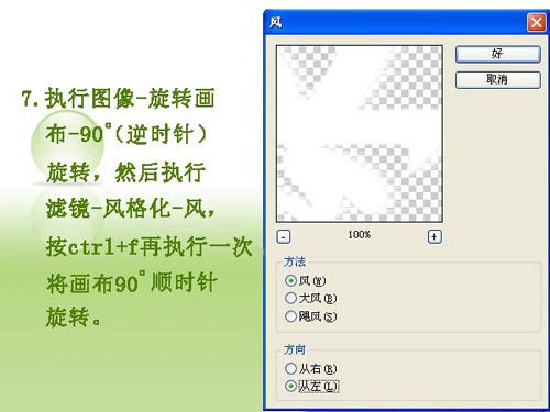 7、执行图像/旋转画布90度逆时针旋转,然后执行滤镜/风格化/风,按Ctrl+F再执行一次,将画布90度顺时针旋转。