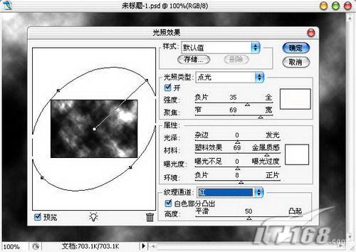 4、接着执行滤镜/渲染/光照效果,将纹理通道设置为红,其他设置保持默认值不变,单击确定按钮应用。如图4所示。